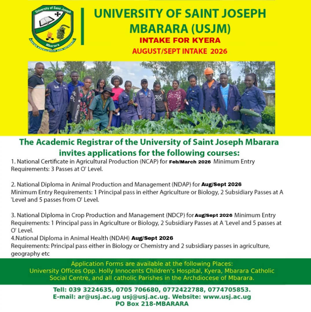The University of Saint Joseph Mbarara (USJM) is pleased to announce that applications are now open for the Kyera Campus August/September Intake 2026. The Academic Registrar invites prospective students to apply for a range of highly practical and career-oriented agricultural programs designed to equip learners with hands-on skills for today’s dynamic agricultural sector.