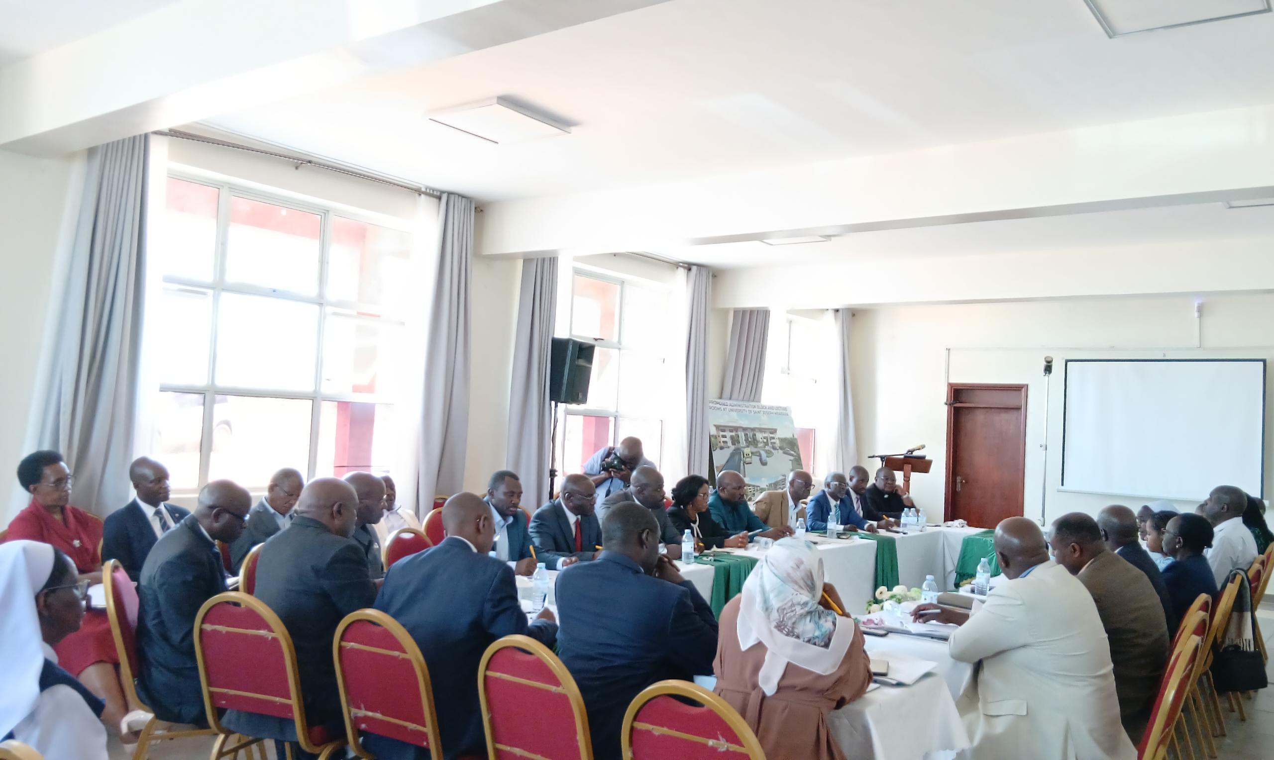 The University of Saint Joseph Mbarara (USJM) recently hosted a delegation from the National Council for Higher Education (NCHE) for a series of high-level engagements aimed at assessing the university’s progress toward attaining its Charter. The meetings brought together key stakeholders, including members of the Governing Council, Board of Trustees, University Administration, Pillars, staff, and student representatives.